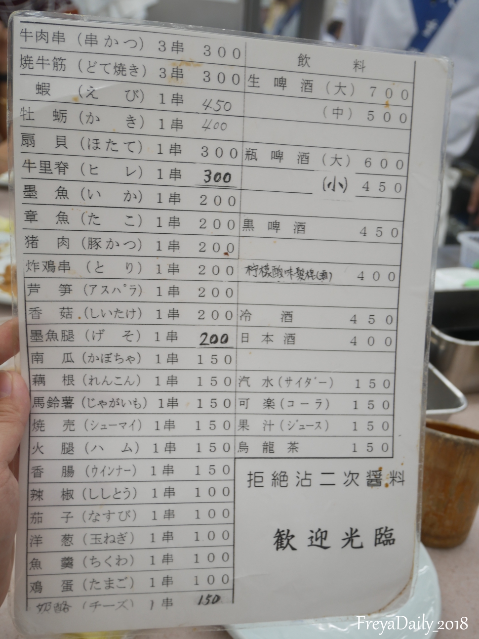 炸雞蛋(1串日幣100元)、牡蠣(1串日幣400元)、扇貝(1串日幣300元)