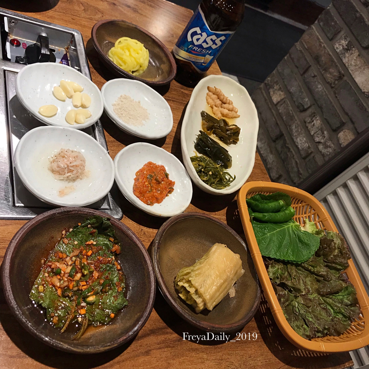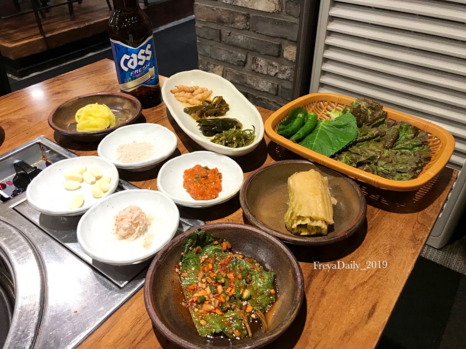 最下面兩盤是醃紫蘇葉和醃白菜,另外附上一盤生菜供包肉用