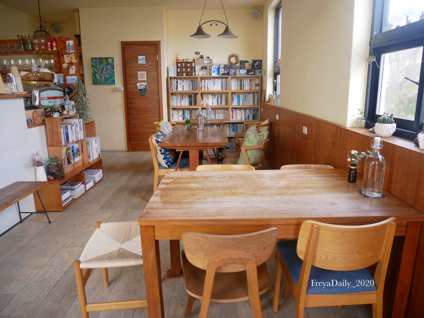 朵思咖啡座位數大約15個左右,木質桌椅搭配木製的多樣層架